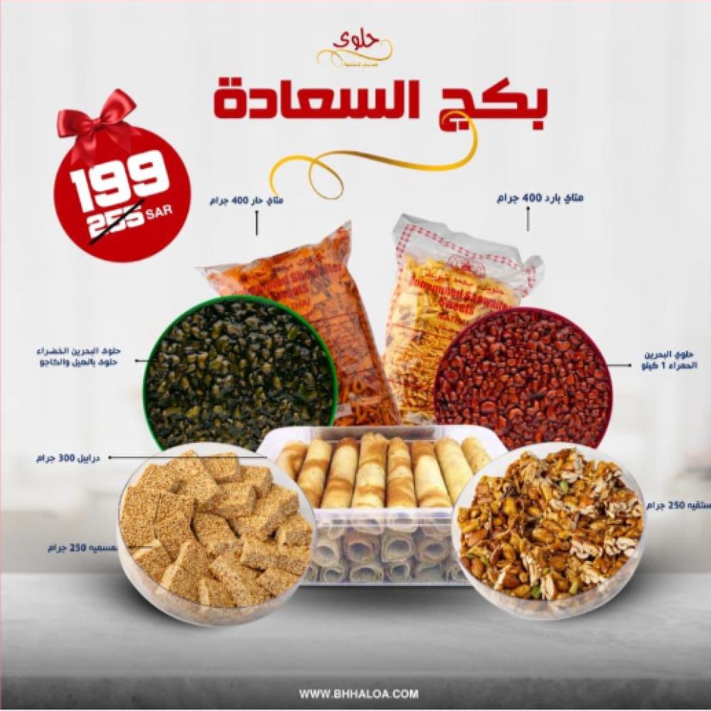 اطلب الآن بكج اليو الوطني من حلوي المكونة من 7 أصناف لذيذة تصلك من البحرين لباب بيتك